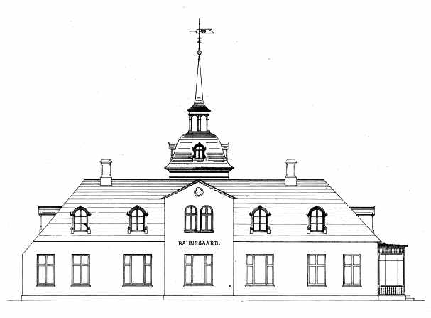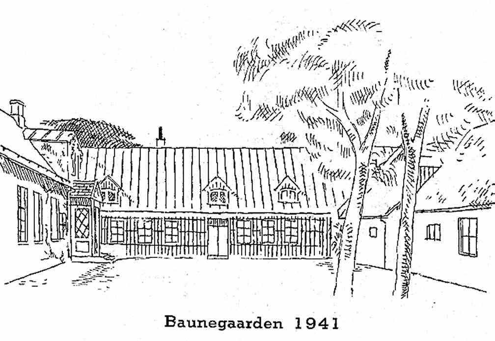 "Ca. 1900. Baunegaard", Baunegårdsvj 31. (Foto: Lokalhistorisk Arkiv i Gentofte). Tegning fra 1941.