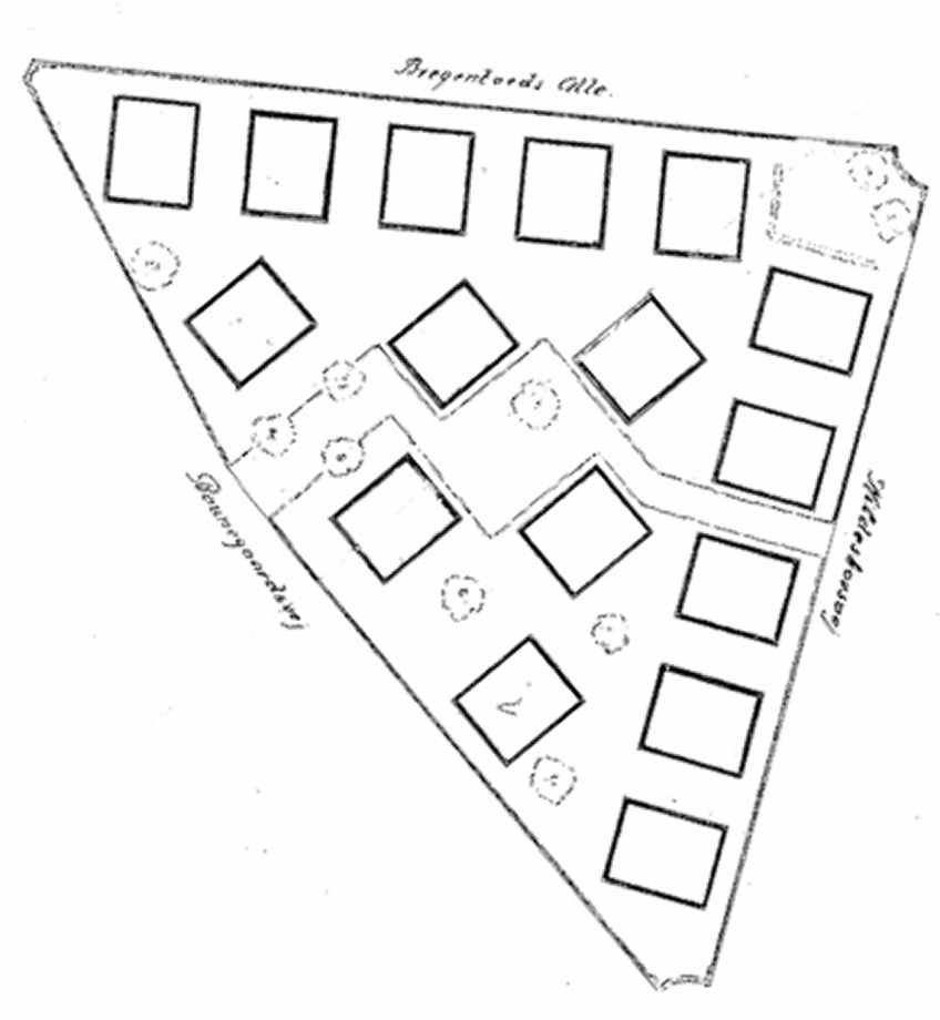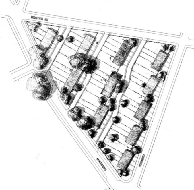 I 1937-1938 havde gårdejeren forsøgt tre gange at få lov til at opføre villaer, rækkehuse eller en større ejendom på grunden mellem Kildeskovsvej, Bregentveds Allé og Baunegårdsvej. Alt blev afslået. Tv. Tegning af gården fra 1907. I midten forslag fra 1937 til rækkehusbebyggelse og forslag til udstykning i villagrunde. Th. Gentofte Skole 1997.
