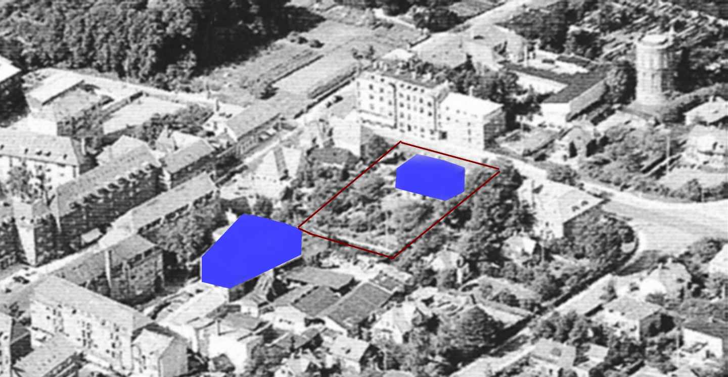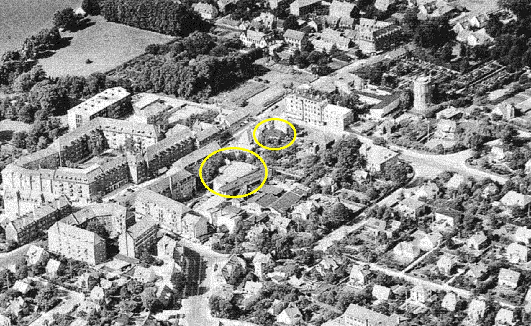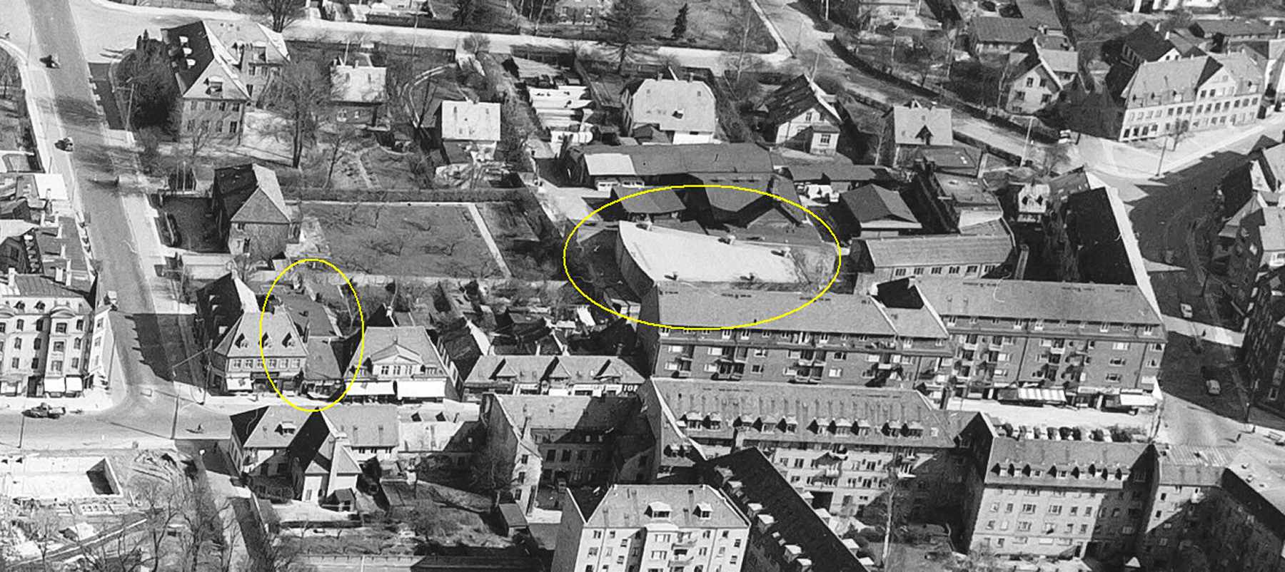 Franz Šedivý tegning fra omkring 1939. Det nye Gentofte Kino ses tydeligt på dette udsnit. Bag ligger Dr. Irgens-Møllers store have med den gule villa, der i 1959-1962 tjente som hovedkvarter for Radio Mercur. Lige vest for villaen se den gamle biografsal fra før 1938, som en mindre hvid bygning.