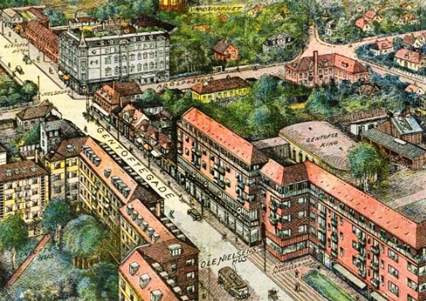 Yderst til højre ses indgangen til nuværende Gentofte Kino, Gentoftegade 39 i O. Nielsens ejendom.