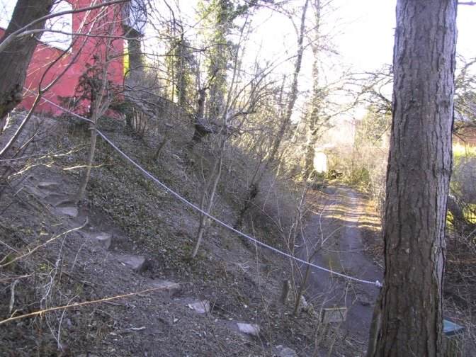 Forrådsmagasin Hvidørevej 49 ved Ordrupvej. Opgang og indkørsel til villa nr. 49.