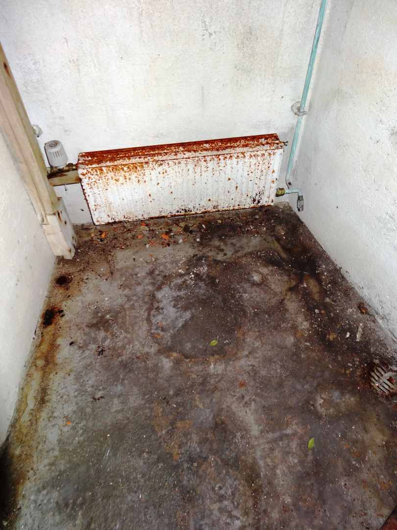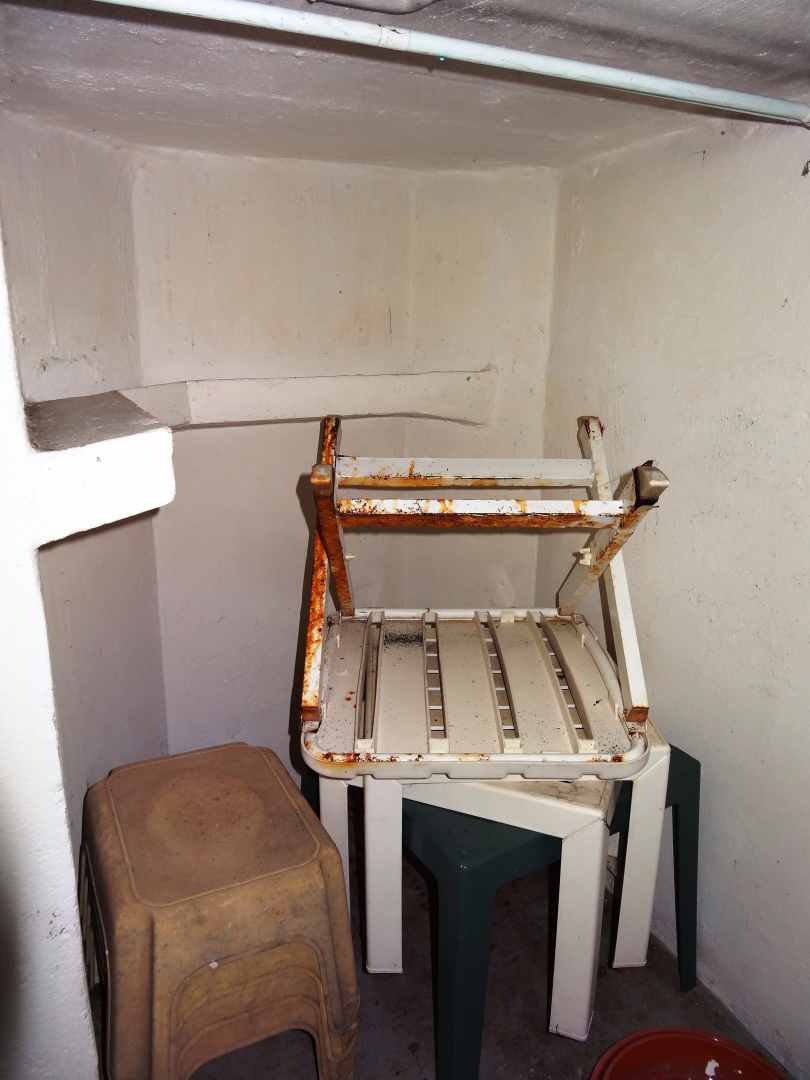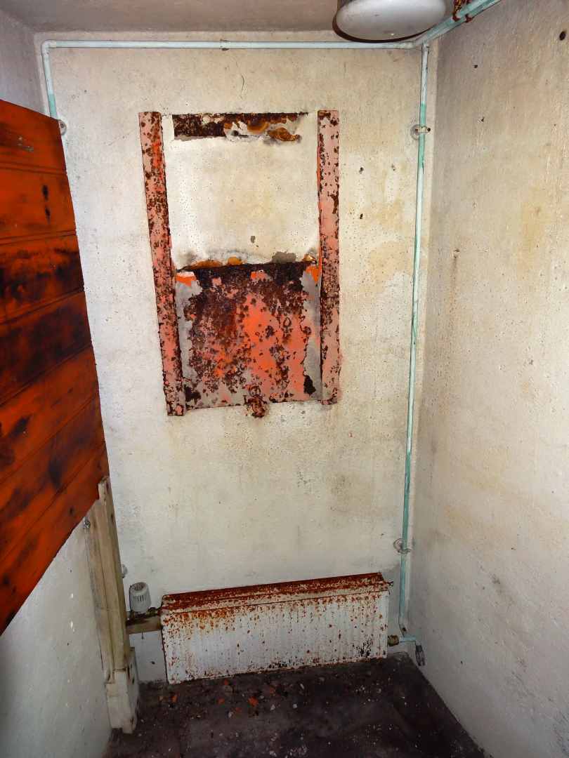 Fotos: Projektørrum med projektørskåret og fundament til gasprojektør.