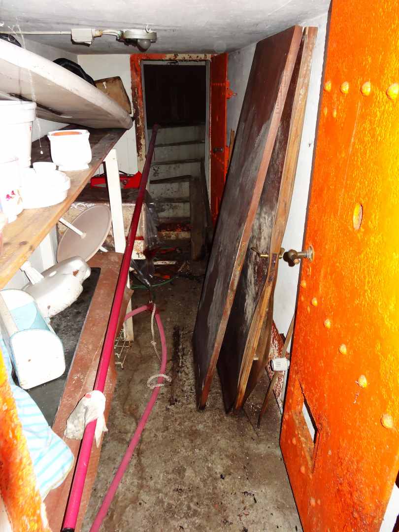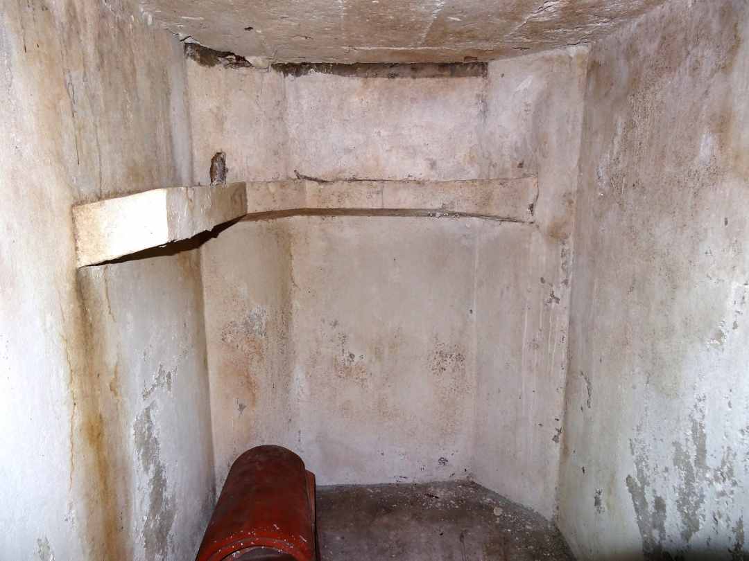 Tv: Mandskabsrum. Midt: Gang til Skydestillingen og skydestillingen. Th: Der har været en åben stilling. Loft er nyt.