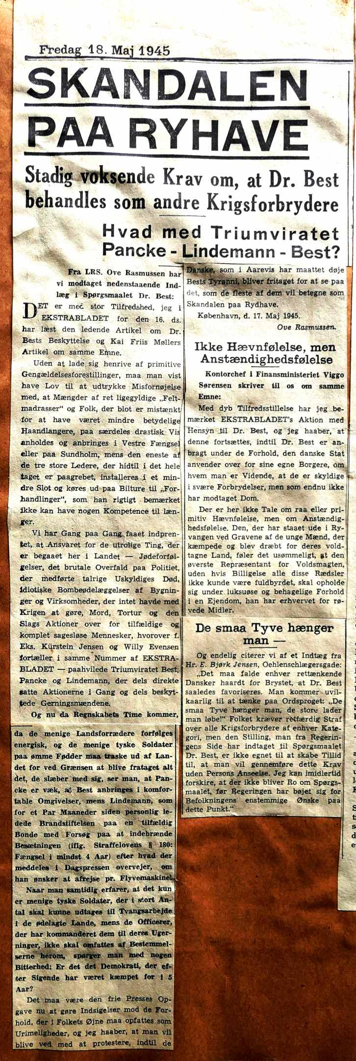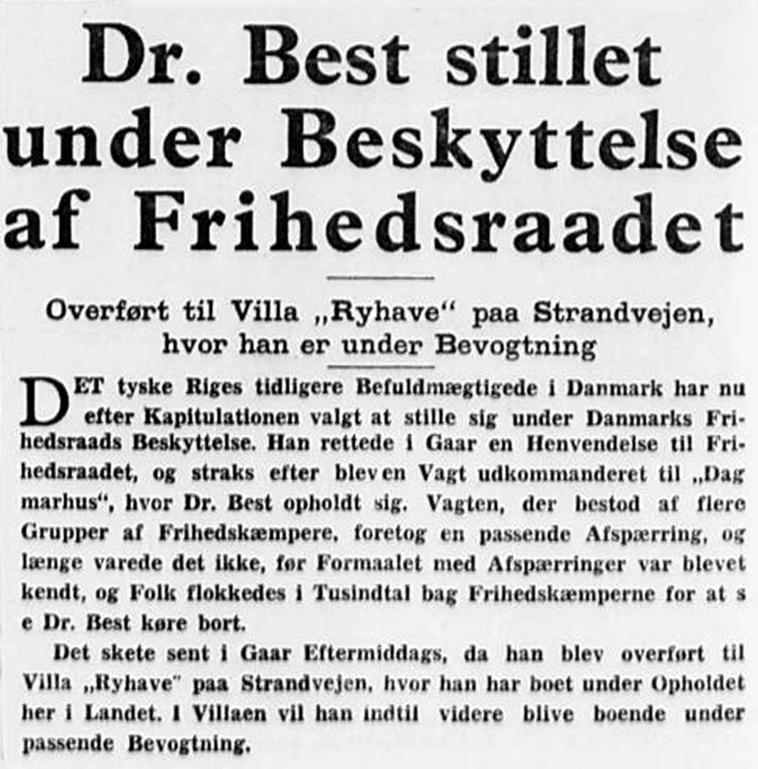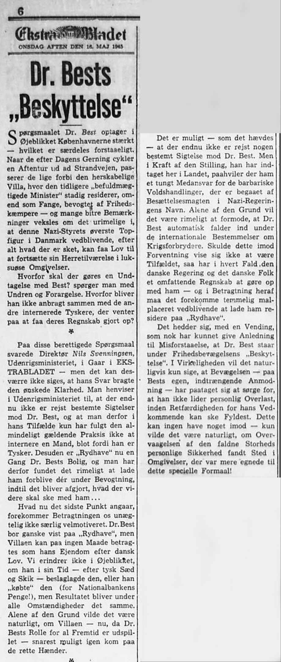 Ekstra Bladet skriver 16. maj 1945 om det urimelige i, at Dr. Best stadig disponerer over Rydhave Se omtalen.