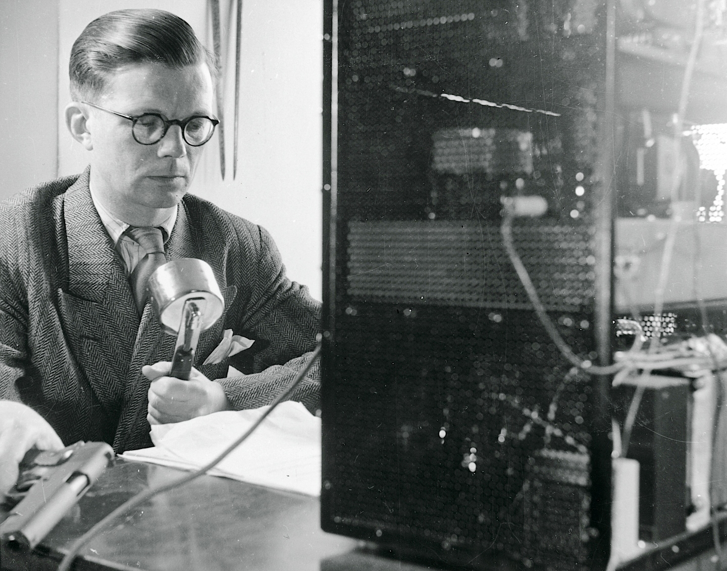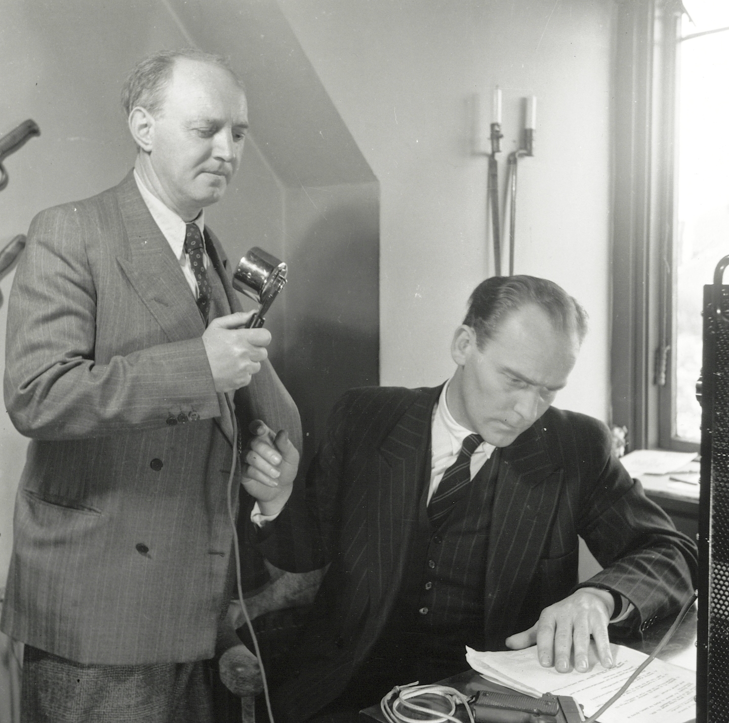 Stående Karl Bjarnhof. Ved mikrofonen redaktørerne Helmer Sørensen (med brille) og Poul Overgaard Nielsen.