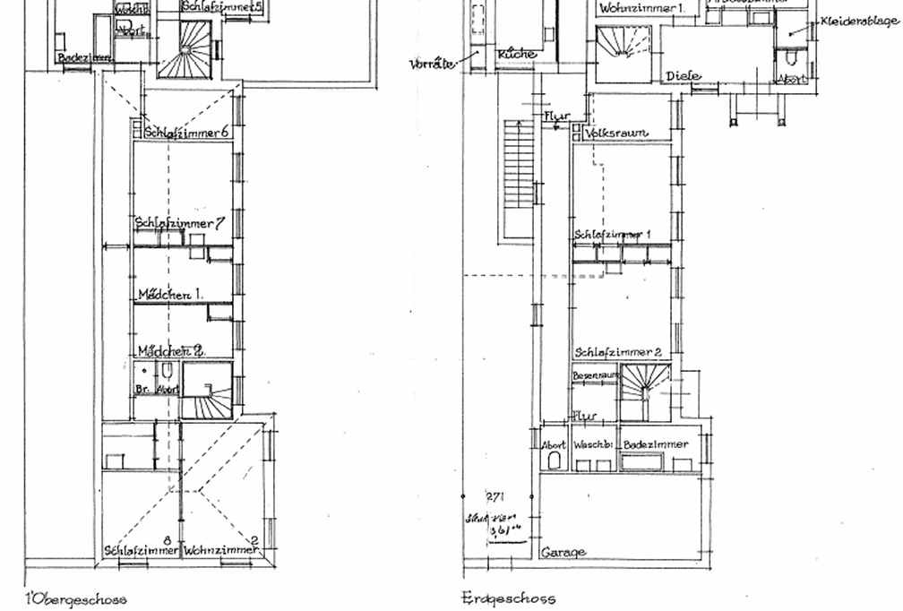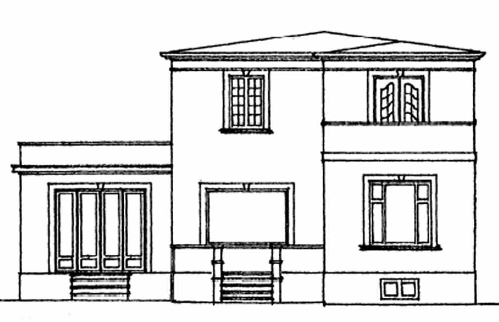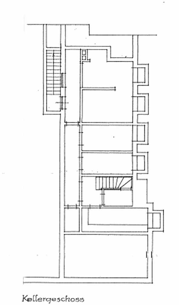 Februar 1944. Den tyske tilbygning på Strandvejen 196. 1. sal, stueetage og kælder. I den første plan fra januar 1944 havde arkitekten anbragt tilbygning direkte i nordskellet, men i dette ene tilfælde hjalp naboens klager.