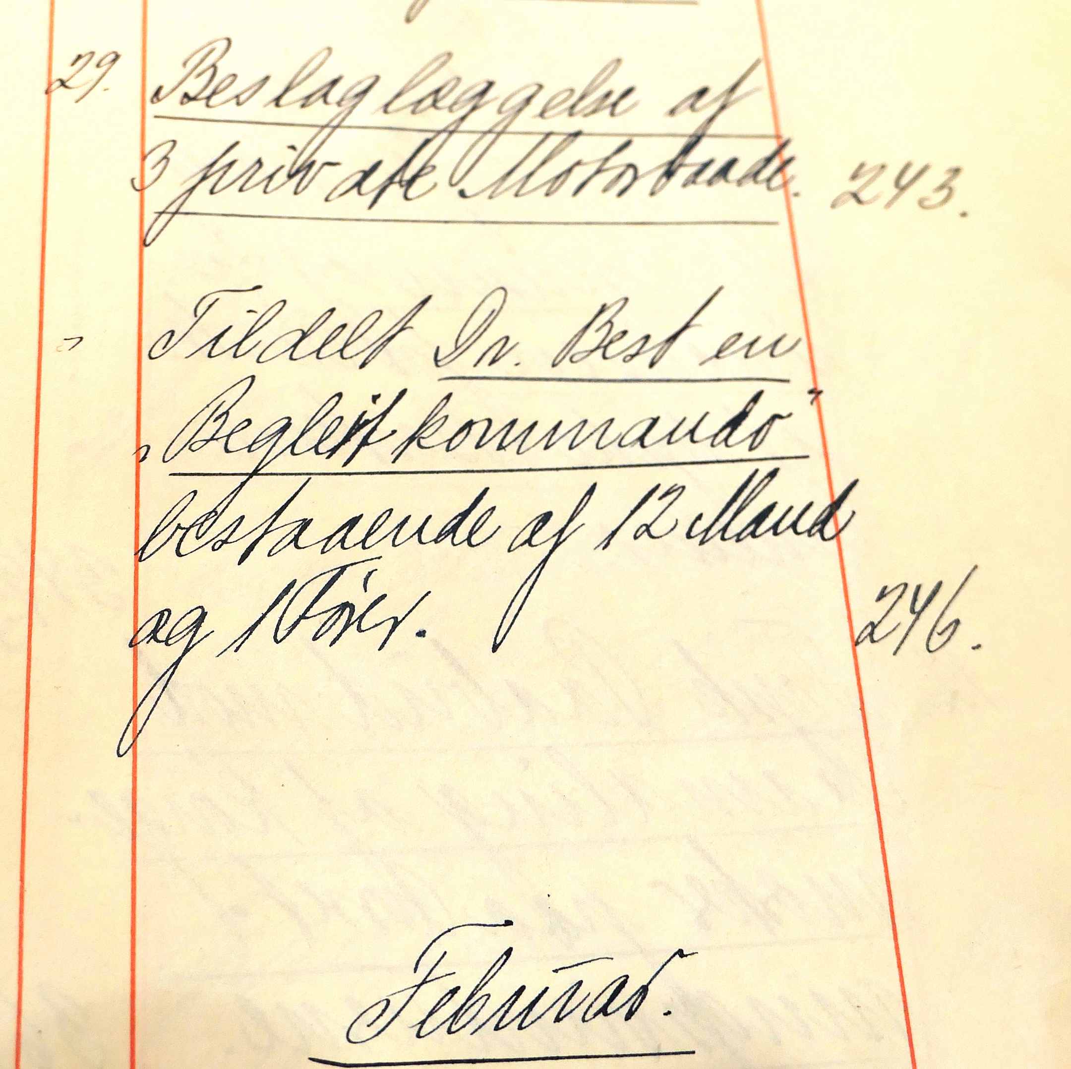 29. januar 1944. Notat i protokol for Justitsministeriets 3. kontor om en Begleitkommando på 13 mand. (Eskorte).