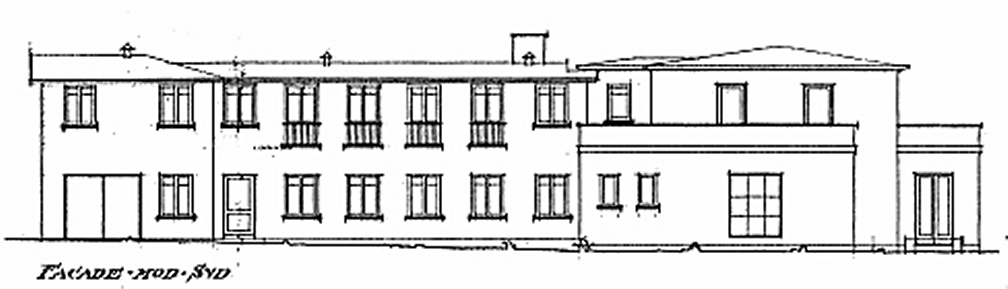 Bygningen set fra Strandvejen. (Foto fra 2003: Dines Bogø). Indgangspartiet. (Foto udlånt af Ingelise Juul Høegen). Grundtegning af bygningen.