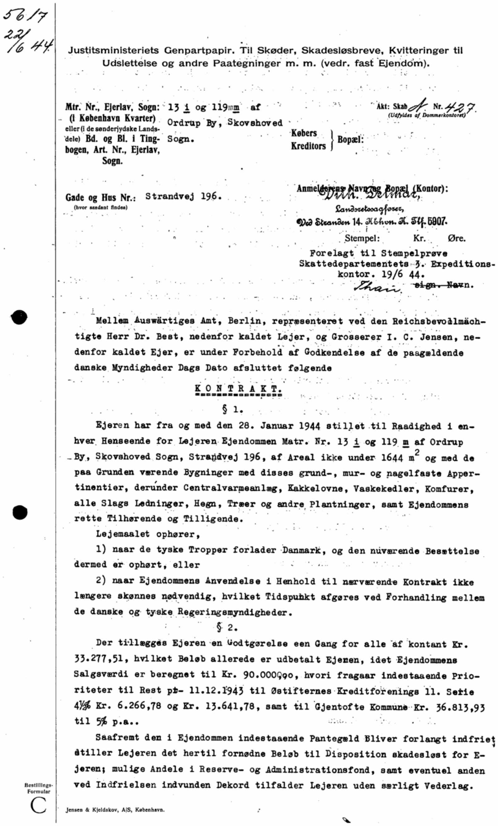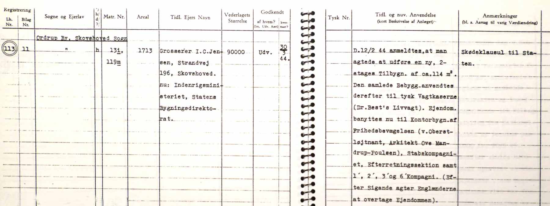 Som man kan se i skødet var ejendommen allerede overdraget til tyskerne 28. januar 1944.
