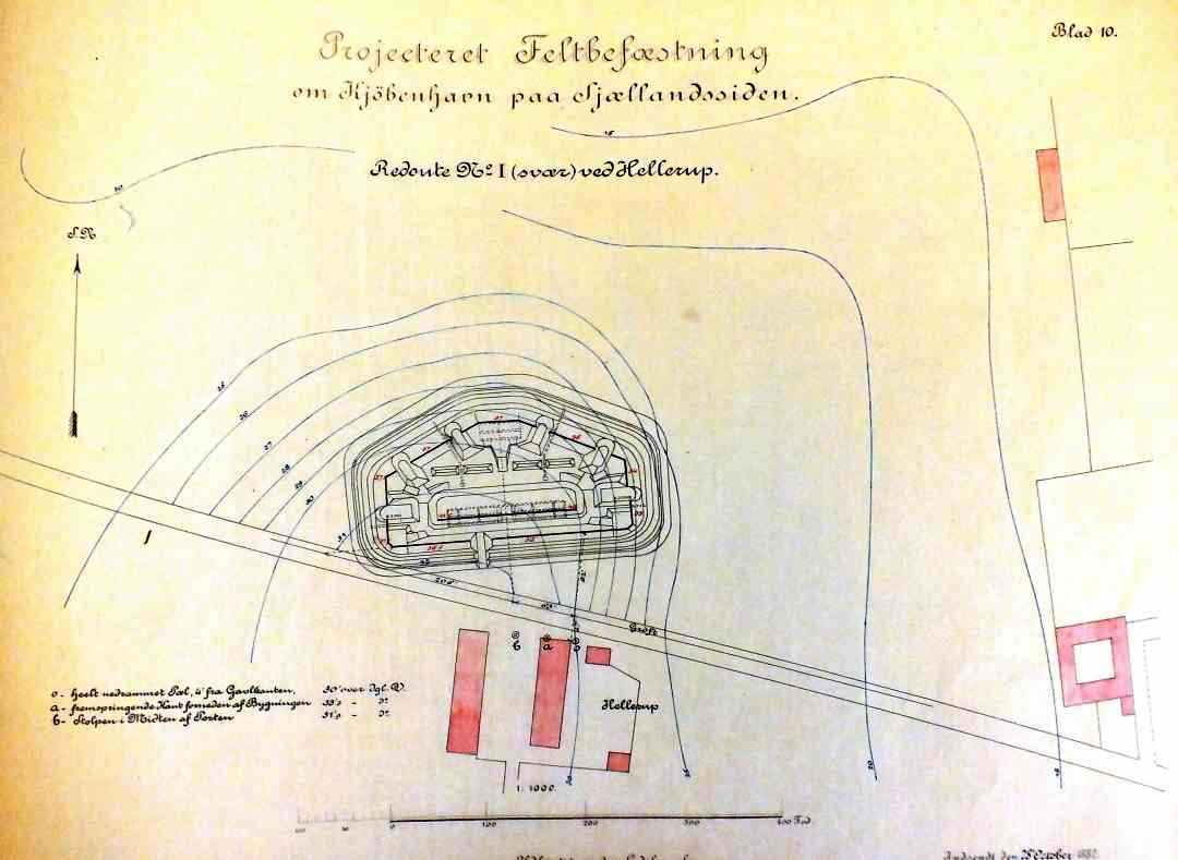 Planlagt svær skanse på Hellerupvej et stykke fra Strandvejen mellem jernbanelinien og Søndre Onsgaard (der ses yderst til højre på tegning). Strandvejen ligger til højre lige uden for tegning.