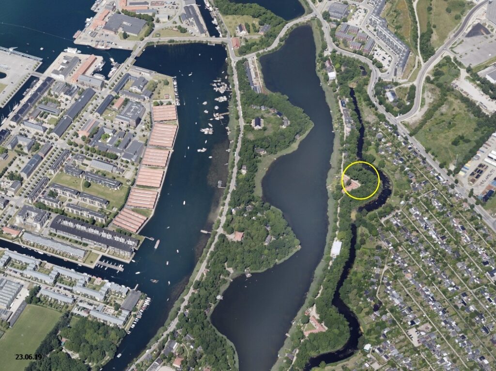 23. juni 2019. De nordlige bastioner og redaner på det oprindelige område "Flaadestation Holmen". De tre nordligste redaner var en del af Holmen. Redan nr. 4-6 var en del af Baadsmandsstræde Kaserne. (Foto: Kortforsyningen).