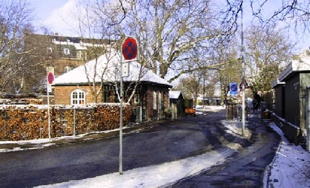 Tv. Maj 1945. Indkørsel til Kriegslazarett Kopenhagen. Th. 29. januar 2004. Indkørsel til Frederiksberg Hospital fra Nyelands Plads. I baggrunden Vestervang (tidl. bygning 34, Abteilung II).