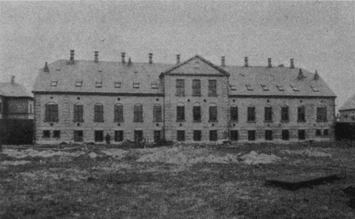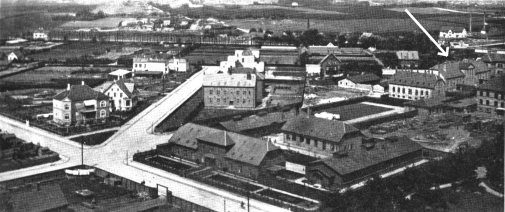 Fattigvæsenets bygning (nr. 30), der blev beslaglagt af tyskerne og indrettet til Lazaret (Abteilung III). De danske sårede modstandsfolk husker specielt de fire små celler i den høje kælderen (markeret med pile).
