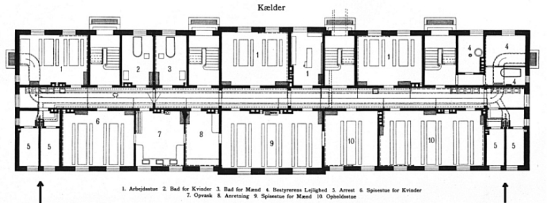 1903. Fattiggården. Bagsiden mod vest (bygning nr. 30). De arrestrum tyskerne benyttede var allerede indrettet i 1903. Cellerne ligger i hver ende af bygningen i den høje kælder. Der var ikke operationsrum i denne bygning.